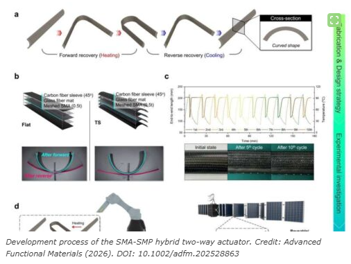 Ka whakakotahi i nga koranu mahara hanga (SMA) me nga polymers mahara (SMP) hei whakamahi i nga kaha o nga rawa e rua.Ko nga SMA he konganuku ka hoki mai ki to ratau ahua taketake ina whakamahana, ko nga SMP he polymers ka whakautu ki te wera me etahi atu whakaurunga o waho ma te whakarereke i te ahua.